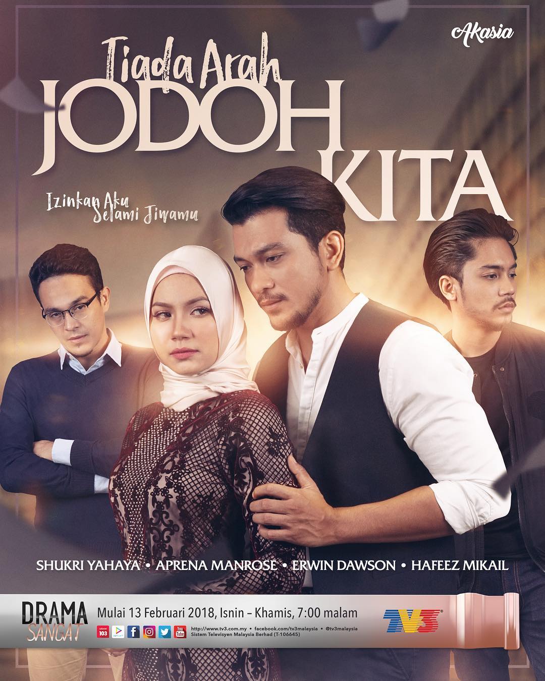 Drama tv3 pukul 7. Drama ini telah dan bakal ditayangkan di stesen tv malaysia merangkumi saluran televisyen percuma iaitu tv3 dan rtm serta saluran berbayar astro dan unifi tv. Pada januari 2011 tv3 mengubah waktu siaran bagi slot akasia adalah pada pukul 7 00 8 00 malam. Akasia merupakan sebuah slot di tv3 yang memaparkan pelbagai drama melayu pada waktu perdana berbentuk drama lipur lara telenovela atau sinetron.