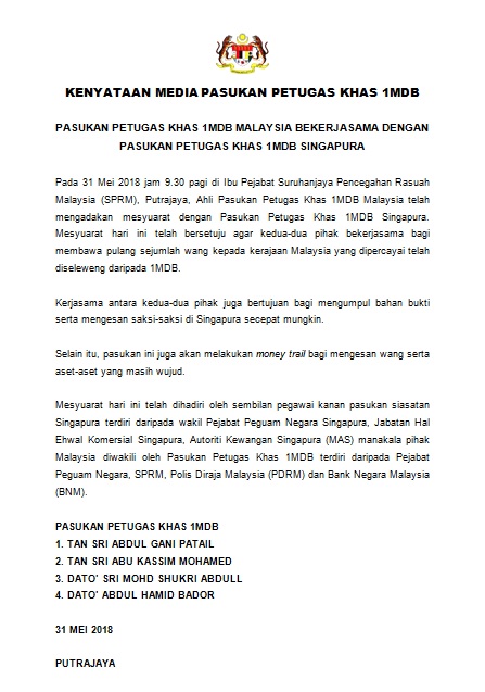 Pasukan Petugas Khas 1mdb Malaysia Bekerjasama Dengan Pasukan Petugas Khas 1mdb Singapura